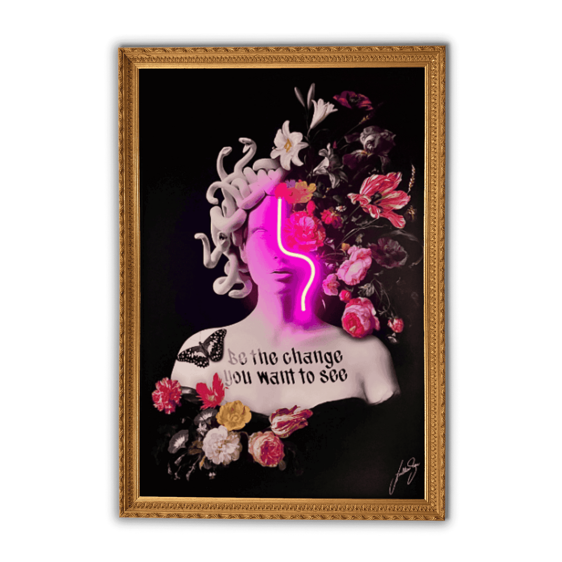 A bold blend of mythology and modern voice. With floral contrasts and a neon-lit gaze, this piece declares: “Be the change you want to see.”