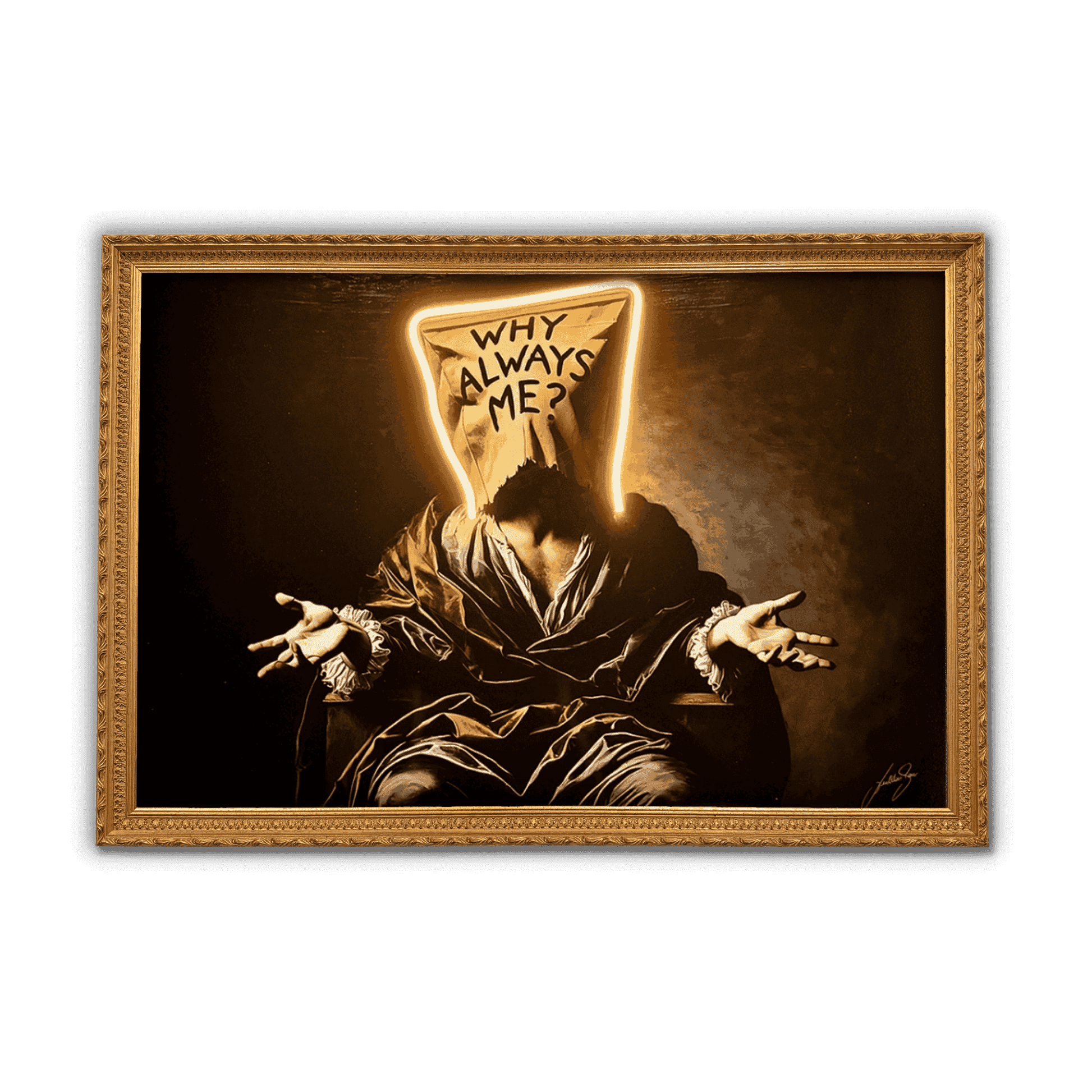 A dramatic sigh, immortalised. “Why Always Me?” fuses classical composition with a raw existential punch. The illuminated message etched across the subject’s face says it all — the daily weight, the irony of fate, the humour in helplessness. It's a bold statement piece that speaks to the overthinkers, the artists, the ones who feel a little too much.